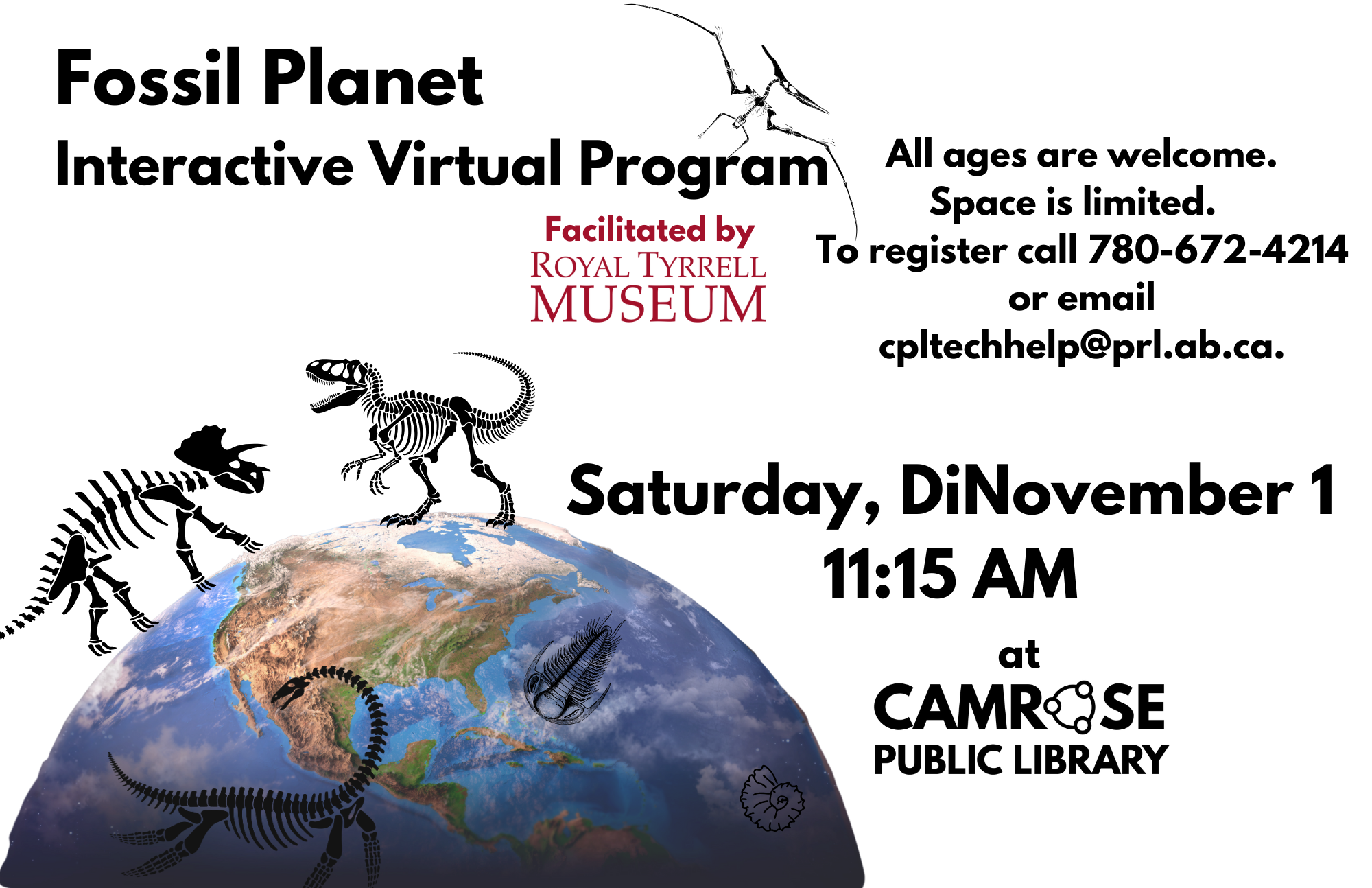 Explore the fascinating world of dinosaurs with this interactive virtual visit to Royal Tyrrell Museum on Saturday DiNovember 1 at 11:15 am at the Camrose Public Library!