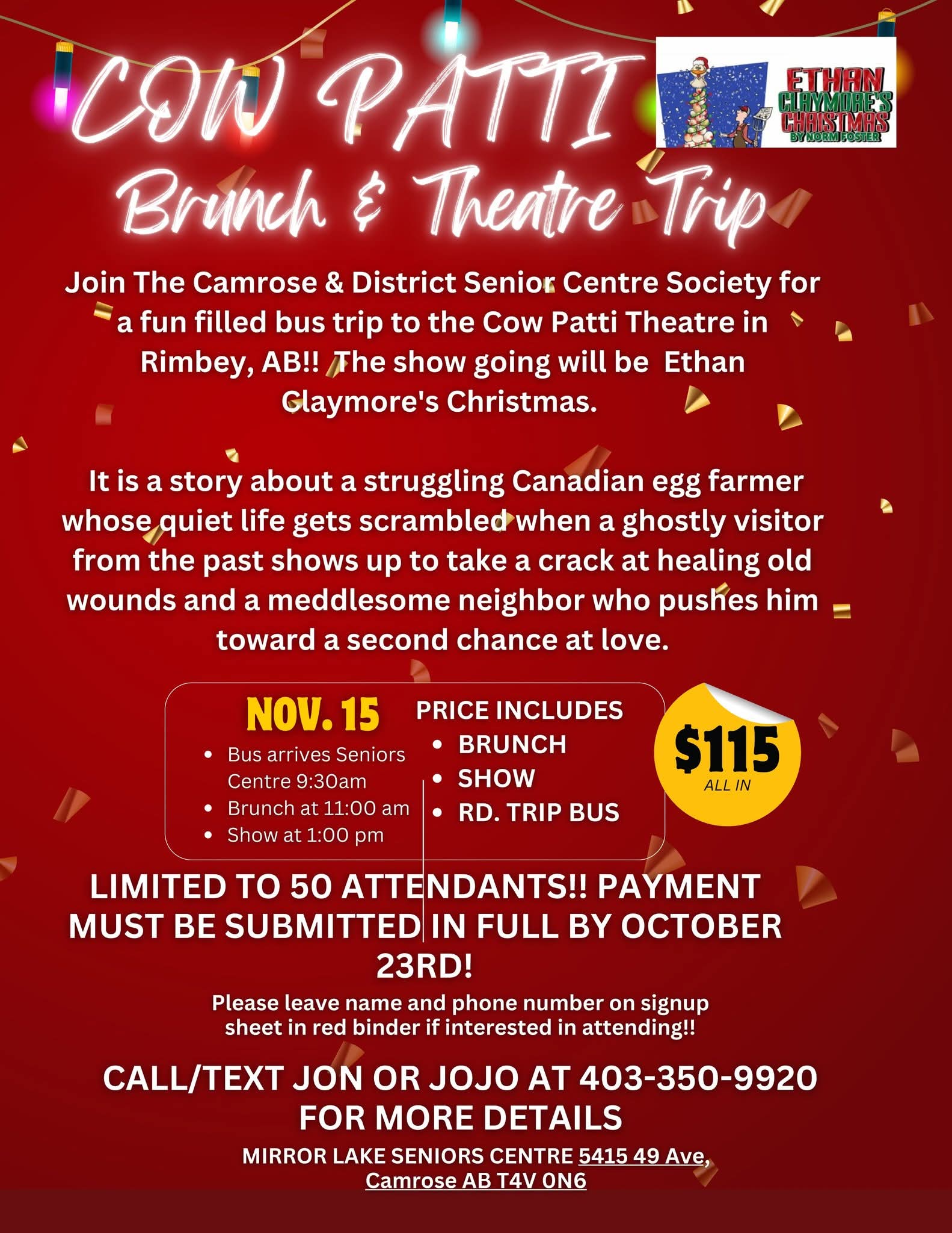 Join us Nov 15 for a trip to Cow Patti Theatre in Lacombe County!