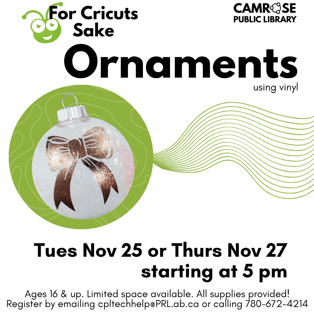 DIY a decorative ornament with vinyl and glitter using a Cricut cutting machine! Register for either Tuesday November 25 or Thursday November 27th, starting at 5 pm. This free workshop is for people ages 16+. All supplies are provided! Register by...
