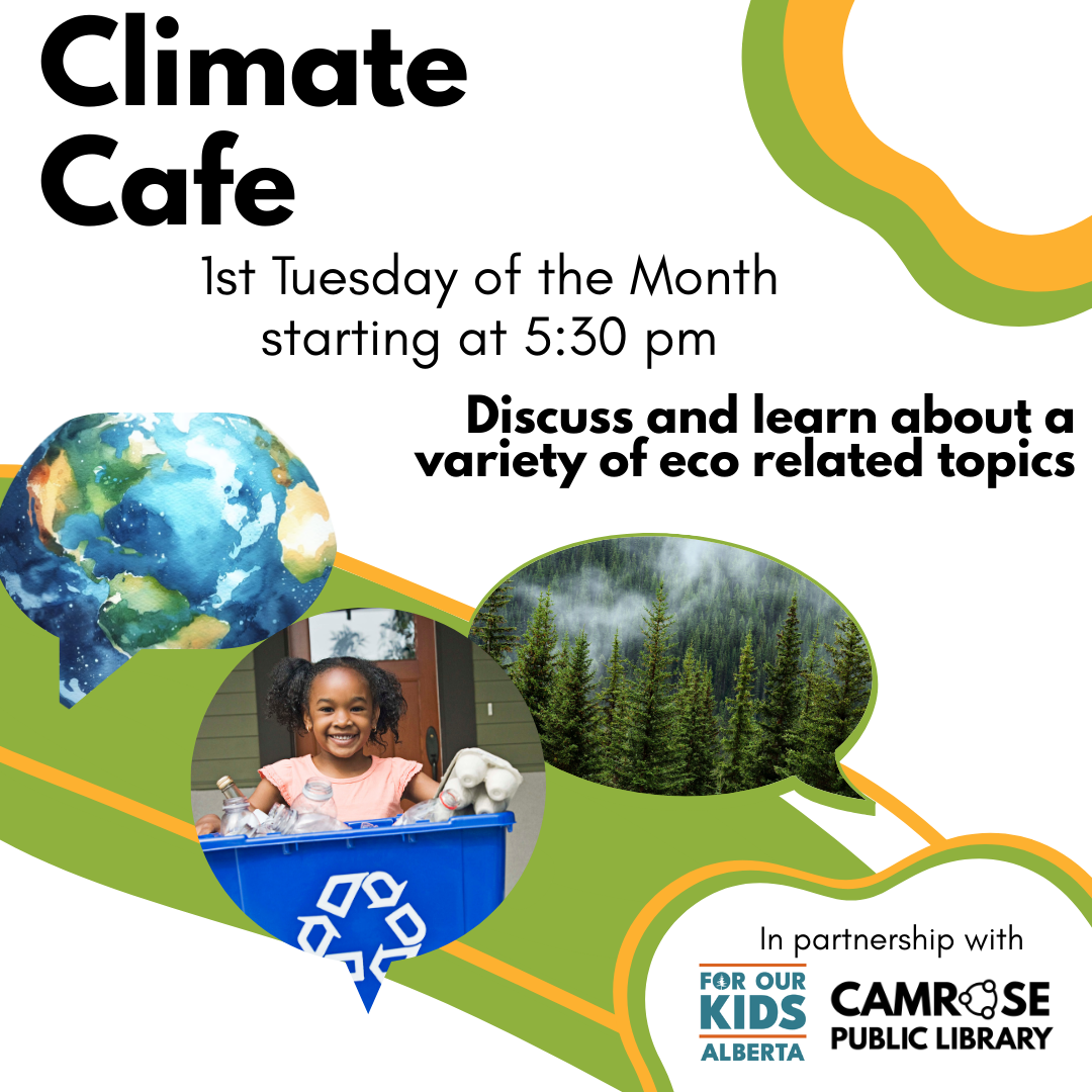 Climate Cafe is a casual get-together for people to discuss and learn about eco-related topics! Some months will have speakers or films, so keep an eye on the Camrose Public Library's social media for more information.
